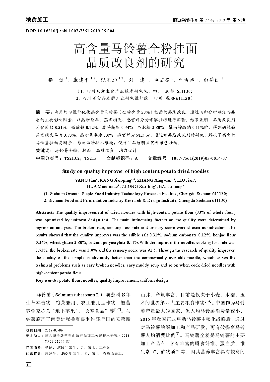 摘 要:利用均匀设计优化高含量马铃薯(全粉含量 33%)挂面的品质改良,通过回归分析确定其品 质的主要影响因素,以熟断条率、蒸煮损失、感官评分为考察指标进行实验。结果表明:品质改良剂 为食用盐 0.31%,碳酸钠 0.12%,魔芋精粉 0.34%,谷朊粉 2.80%,聚丙烯酸钠 0.11%时,得到的挂面 蒸煮损失率为 3.73%,熟断条率为 3.0%,感官评分 91.5 分。通过对品质改良剂的研究,解决了高含量 马铃薯挂面易断条、易浑汤等技术难题,使样品品质明显优于市售挂面。