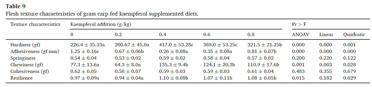在该论文中,研究人员利用Universal TA质构仪测定草鱼幼鱼肌肉的硬度、粘附性、弹性、咀嚼性、内聚性和回复性。硬度、咀嚼性和回复性等质构特性是肌肉最重要的品质指标,可用于评价肌肉的可接受性和机械加工性。该研究结果表明饲料中添加0.8g/kg山柰酚可增加草鱼幼鱼肌肉的硬度、咀嚼性和回复性。