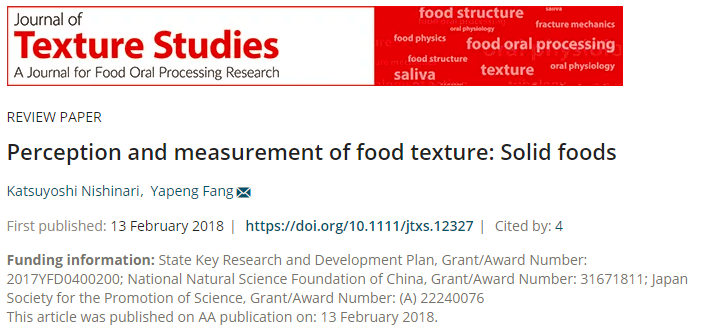 上海交通大学农业与生物学院方亚鹏教授2018年2月在《Journal of Texture Studies》在线发表了题为“Perception and measurement of food texture: Solid foods"的综述文章。